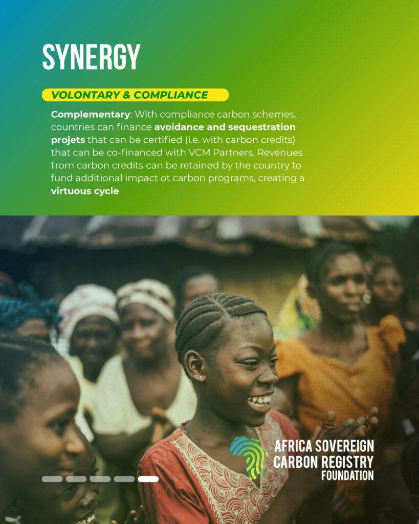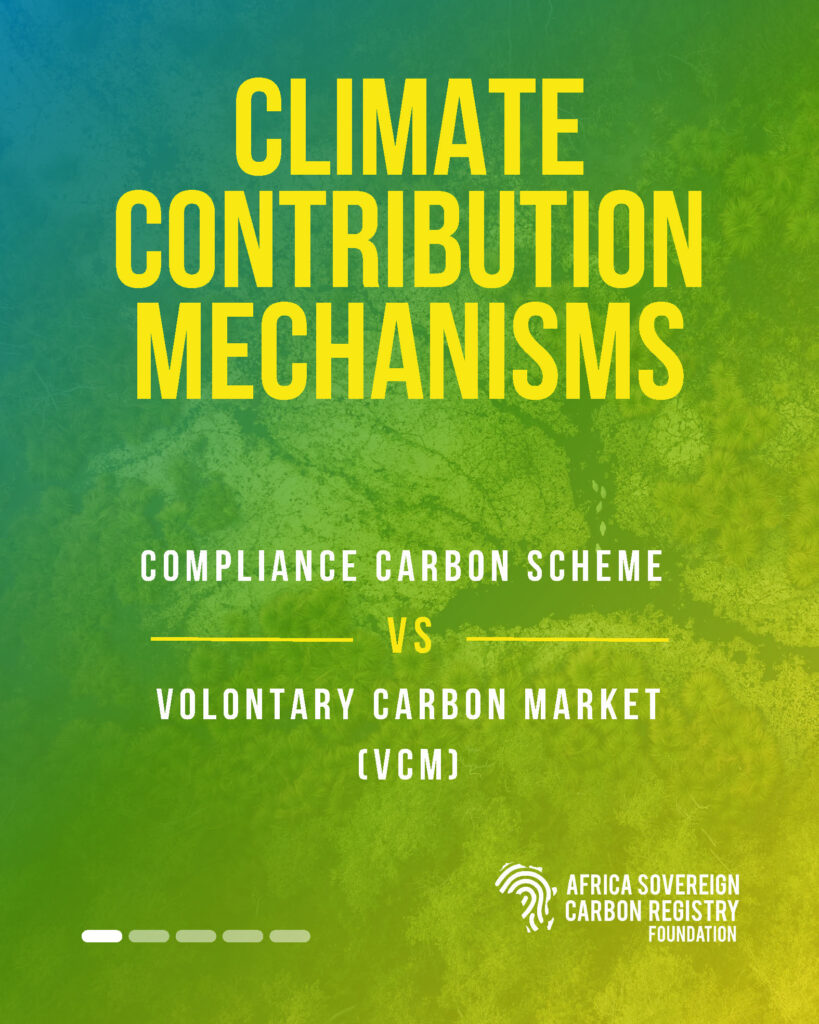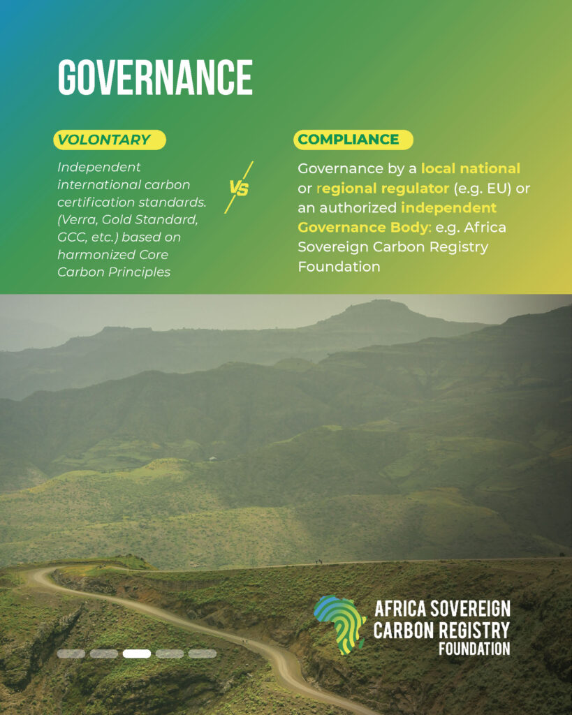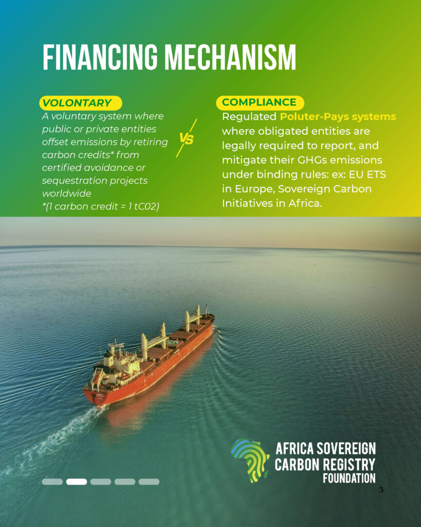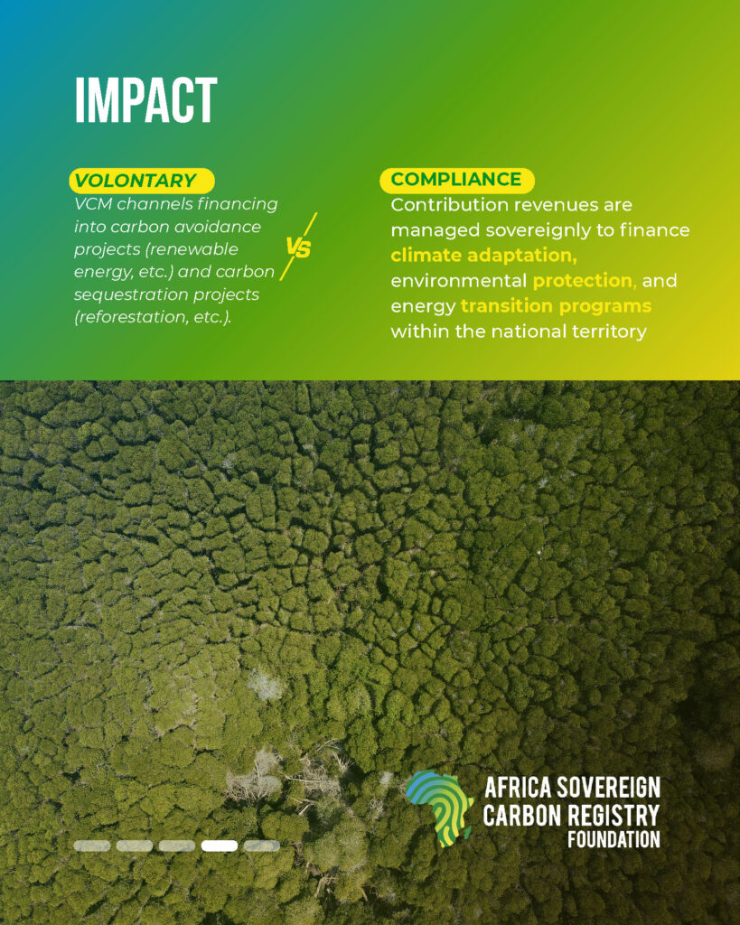 ๐‚๐จ๐ฆ๐ฉ๐ฅ๐ข๐š๐ง๐œ๐ž ๐ฆ๐ž๐œ๐ก๐š๐ง๐ข๐ฌ๐ฆ๐ฌ are based on the Polluter Pays principle. They require regulated entities to account for and mitigate their emissions under binding rules. In Africa, this logic takes on a sovereign dimension through Initiatives registered with the Africa Sovereign Carbon Registry Foundation, ensuring that revenues remain under national control and are reinvested in adaptation, energy transition, and ecosystem protection.